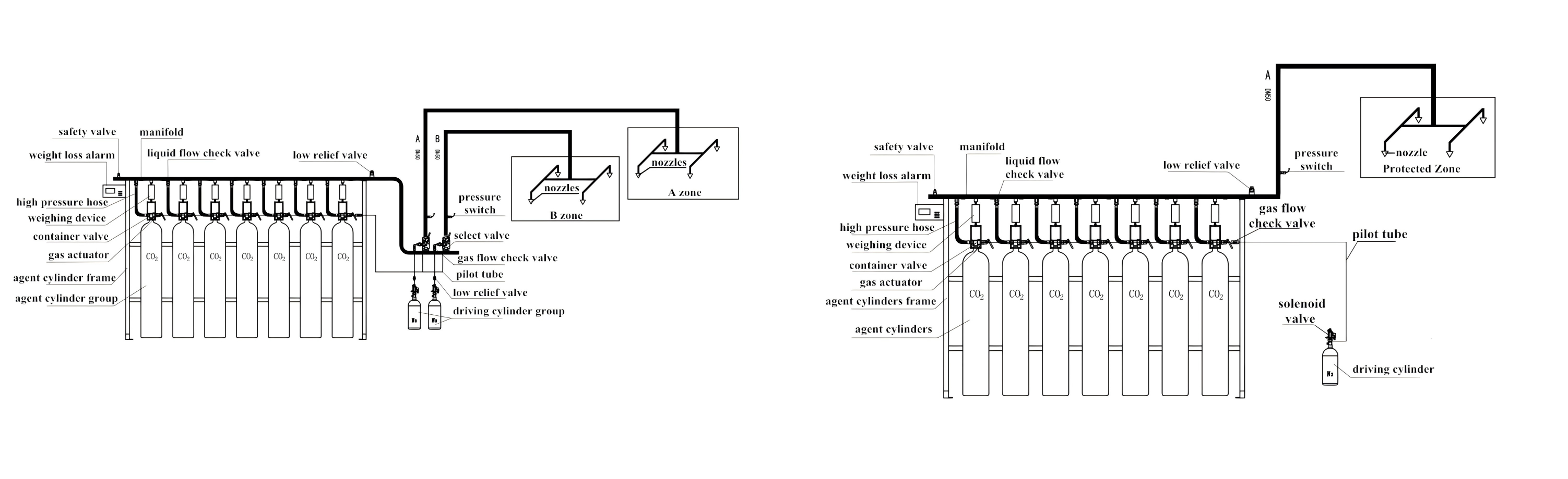| System Classification: Depending on the requirements of the protected areas, pressurized CO2 fire extinguishing systems can be designed in two ways: single-zone unit systems and multi-zone combined distribution systems. Using closed flooding, they can provide single-zone or multi-zone fire protection. The system offers three activation modes: automatic, manual, and mechanical emergency control. The system is technologically advanced, highly efficient, and easy to maintain. | |