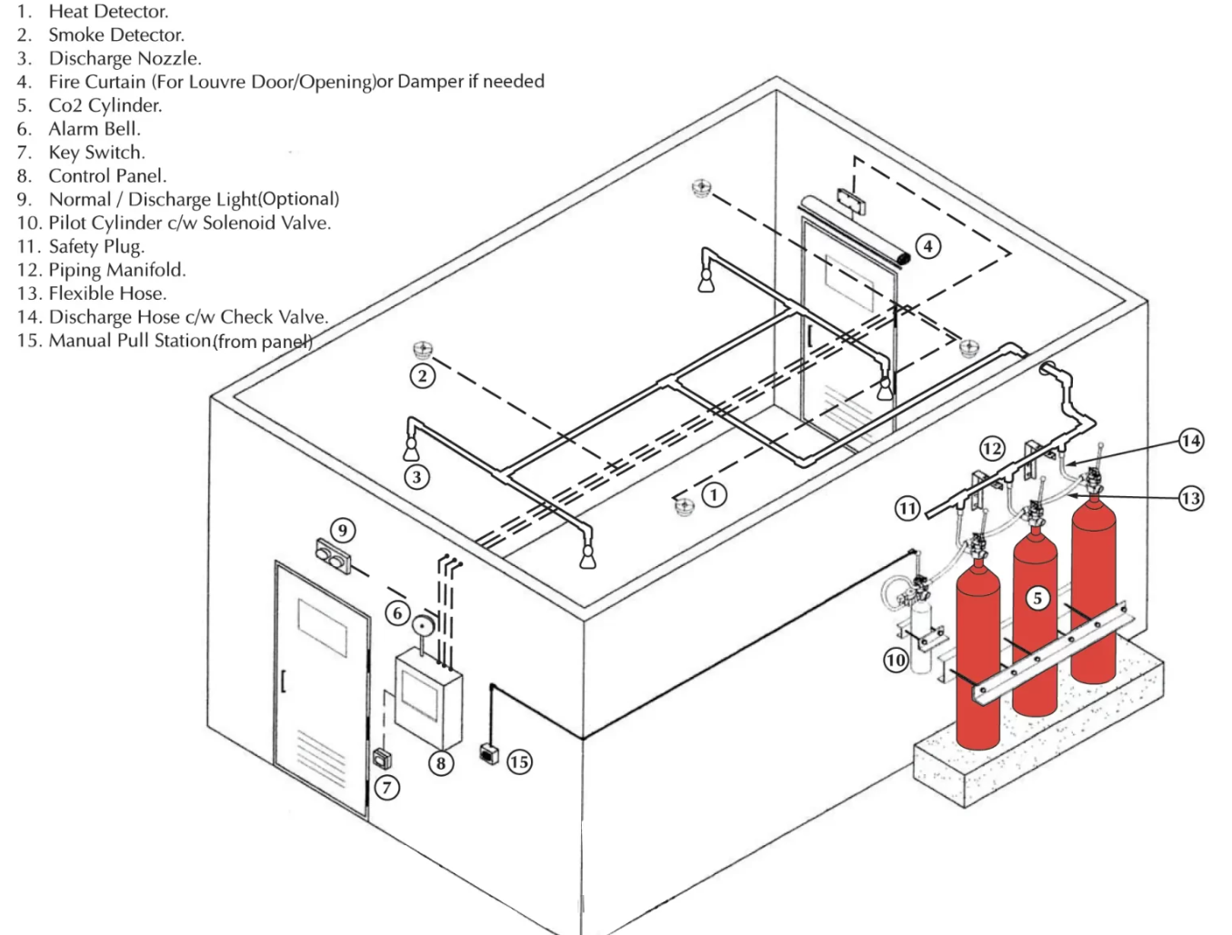 | Product Components: The pipe network-type CO2 automatic fire extinguishing system consists of three main components: fire extinguishing devices, pipe fittings, and electrical accessories. The fire extinguishing device includes the gas cylinder for filling and storing CO2, the bracket for triggering the cylinder to spray the extinguishing agent, and the drive device (nitrogen cylinder). The pipe fittings include pipes such as high-pressure galvanized steel pipes, flanges, and elbows that connect the fire extinguishing device and direct the extinguishing agent to the protected area. The electrical accessories detect and monitor the entire protected area and control the entire system, while also issuing evacuation alarms and preventing the spread of fire. These three components, integrated together, effectively achieve automatic fire detection, monitoring, alarming, and extinguishing. | ![]() |